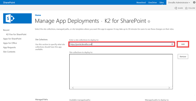- The Manage App Deployments > K2 for SharePoint page opens. On the Manage App Deployments page, there are two methods to deploy the app to the required site collections. Firstly via the Site Collections section where site collections can be individually specified and secondly via the Managed Paths section, where all site collections can be specified via the (All Paths) option. The second method is recommended unless you need to control which site collections serviced by the app catalog are integrated with K2. Use step 3 for using individual site collections and step 4 for using paths.