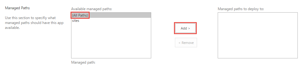 - In the Managed Paths section, select the (All Paths) option and click Add. This deploys the app to all site collections and associated subsites that reside in the farm (All Paths), or under a valid path, such as sites. This is the more efficient and recommended way to accomplish K2 integration with SharePoint than step 3 where you specify site collections individually.