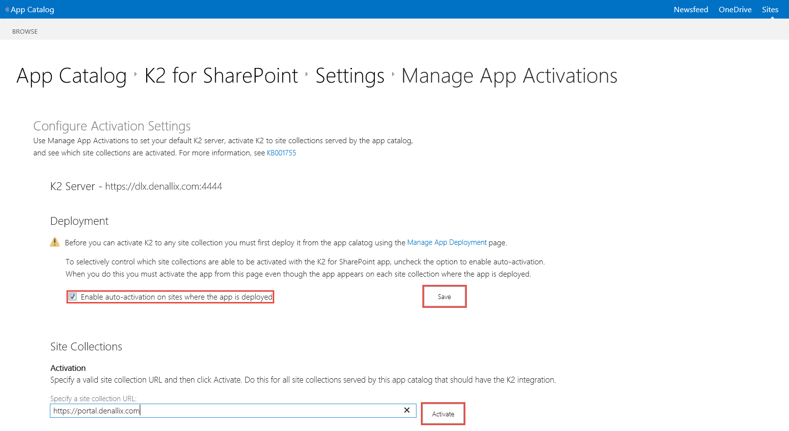 - Multiple site collections can be activated all at once if required, simply repeat the above steps on the Manage App Activations page.Ensure that if multiple site collections are required for activation, the app is deployed via the Manage App Deployments page first. For more information see KB001755 - K2 for SharePoint Deployment and Activation.