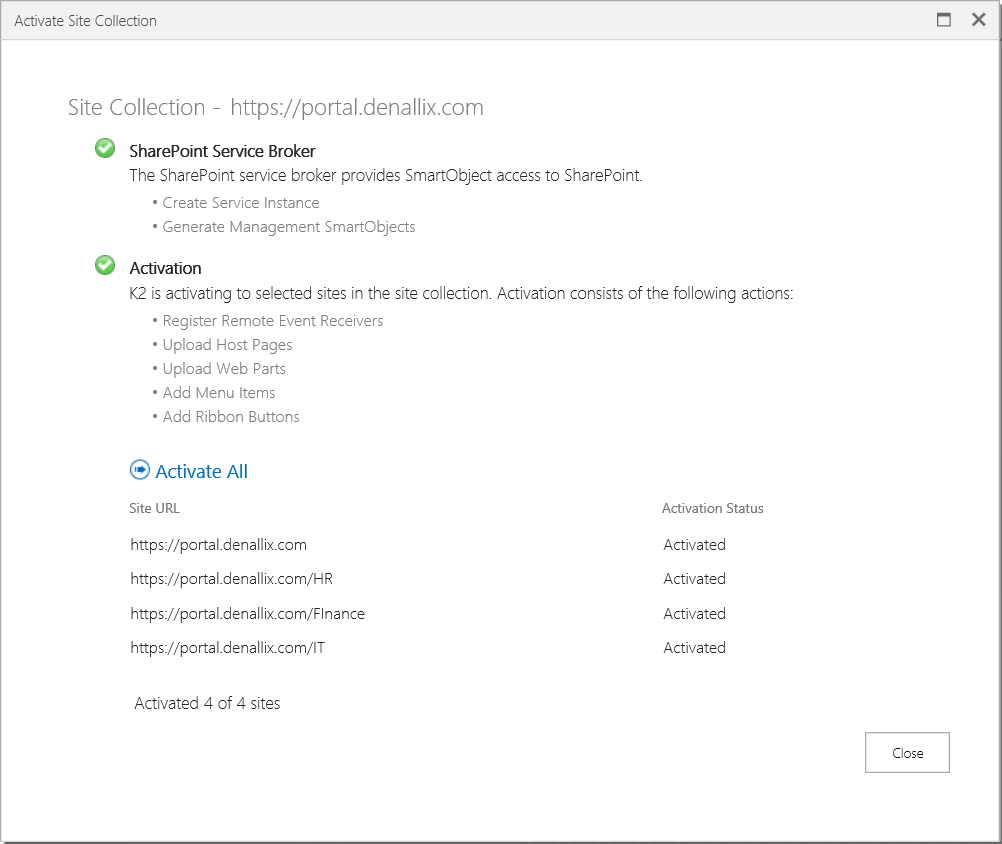 - Click the Close button on the Activate Site Collection page.