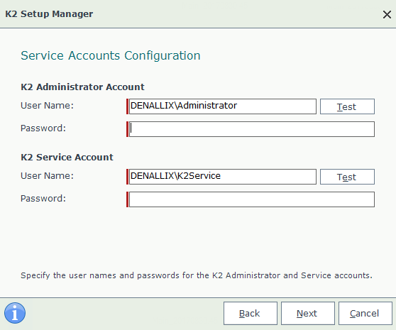 The Service Accounts Configuration page configures two accounts; the Administrator Account and K2 Service Account. These accounts are the Domain User accounts used by the Administrator and the K2 Server.