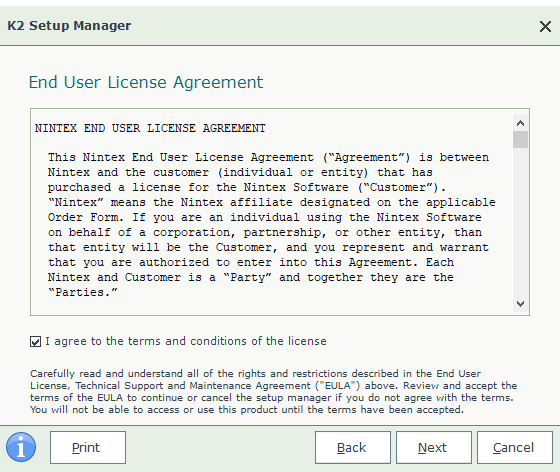 The EULA describes the terms and conditions for installing K2 Five (in whole or in part). You can only install the software when you agree to the terms and conditions as outlined in the EULA.