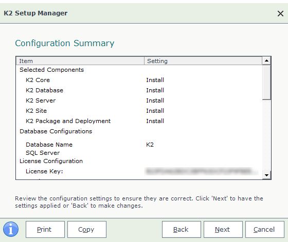 The Configuration Summary screen displays the options captured by the Setup Manager Wizard. Confirm that the summary reflects the options you want to install, because once the Setup Manager starts the installation, the installer cannot be interrupted.