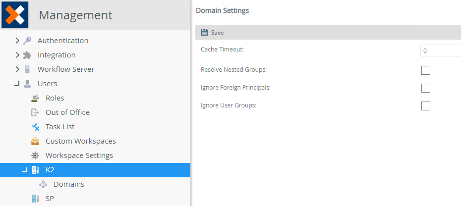 | Ignore Foreign Principals | This setting either allows (when False) or denies (when True) membership principals from foreign domains from resolving. Also referred to as cross-domain or cross-forest membership, Foreign Security Principals allows users from a different domain ( DOMAIN-B) to become members of groups on another domain (DOMAIN-A). If a group contains a foreign principal, and this setting is False, K2 resolves the user. If the setting is set to True, the user or group is not resolved. |