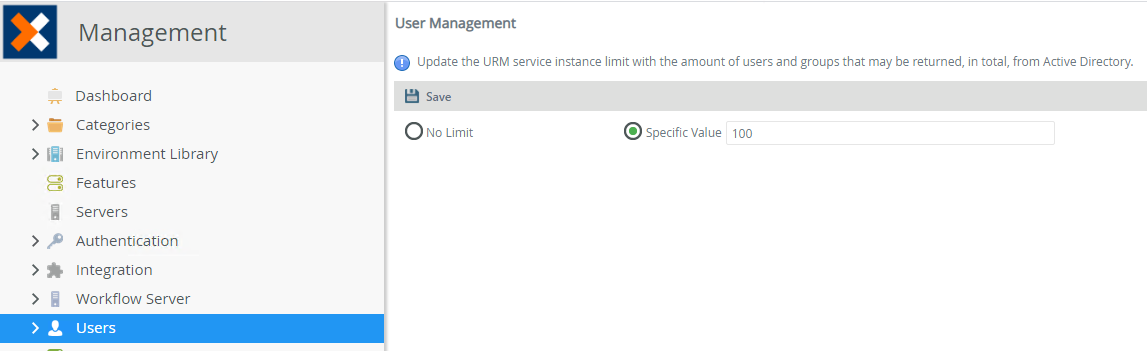 The AD user manager returns all results for the queries passed to it. You can limit the number of users and groups returned for better performance if you have a large directory. Use the User Management page on the Users node of the K2 Management site to limit the number of users returned. The default value is 100 when specifying a limit.