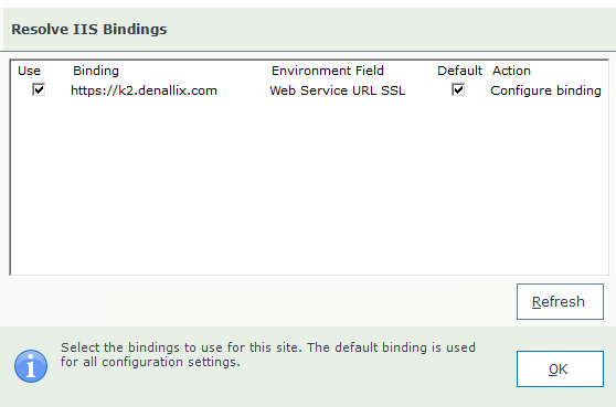 If the selected IIS binding in the Bindings page does not match the URI for the Security Token Service in the K2 database Identity.ClaimIssuer table, you will need to resolve which STS issuer to use. You do this by making a choice on the Resolve Security Token Service Issuers page. For more information on the IIS Bindings see the topic: K2 Site Configuration.