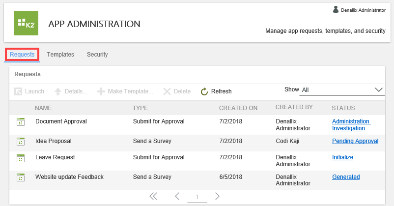 On the App Administration page you have three tabs, Requests, Template and Security. Use these tabs to perform app administration tasks.