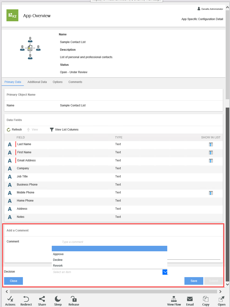 This section covers the administration of List Collaboration apps. The List Collaboration app has two administrative sections: Main Details and Reporting and Draft Items. As the K2 App administrator, you approve (or decline) new apps.