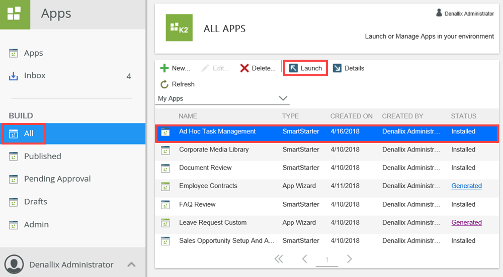 - On the Apps page, select the app from the All option in the Build section. Select the app and click Launch.