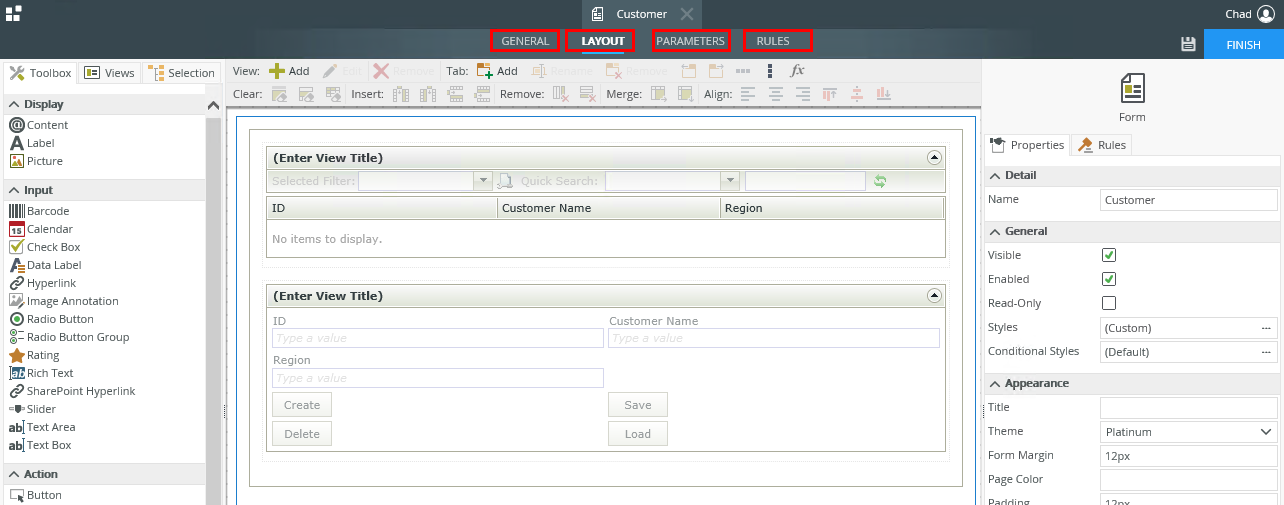 Forms consist of layout, controls, parameters, and rules which you configure. Use the tab-based navigation at the top of the canvas to configure these aspects of your form. To create a new form, right-click a category in the category tree and select New Form, or click on the Form quick link on the K2 Designer landing page. Once you have created a form, you can reopen it by selecting the Edit Form option.