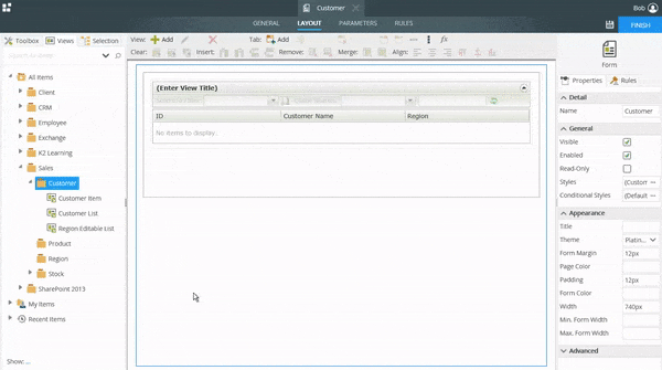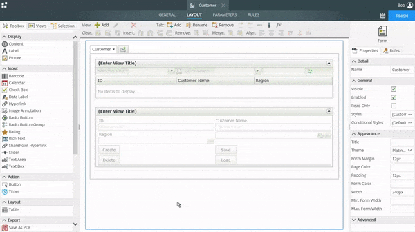 Each control, view and form has configurable properties. You can also use rules with these components. See the Controls,Views and Rules topics for more information. This example illustrates how to