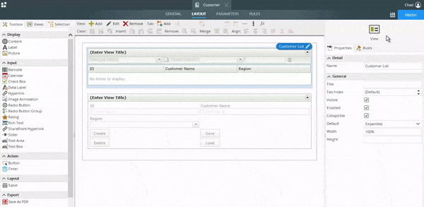 - Views - The Views tab includes views that you can use on your form. Use these views with rules and parameters.
