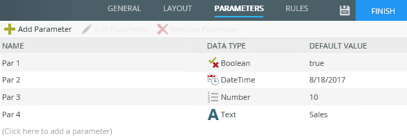 Default Value | The default value used when you run the form with parameters. Validation is performed on the input values according to the data type you use, for example if you use Number as mentioned above, you cannot enter text in runtime | Type a value if a default value should be used (optional) |