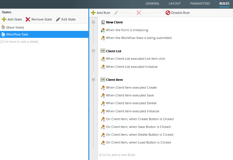 When you integrate a form with a workflow and select the option Create a new State, the When the Workflow View is being submitted rule is automatically inserted into your form as part of the workflow integration to make sure the worklist item is actioned when certain conditions are met.