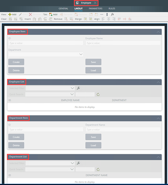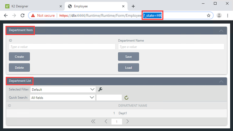 The Employee form opens in a new browser window in designer mode. Type ?_state=HR at the end of the URL and press Enter on your keyboard. The Employee form shows the configured views for the HR state (Department Item and Department List views).
