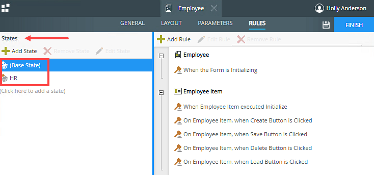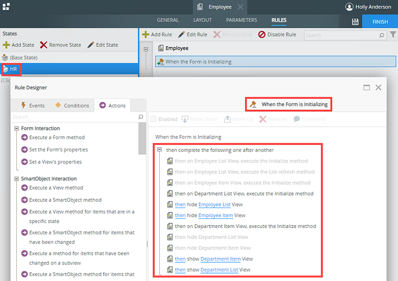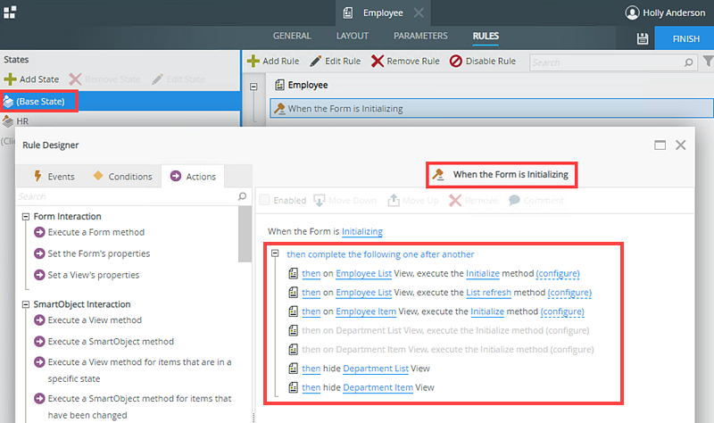 In this example, you use a form called Employee containing four different views; Employee Item, Employee List, Department Item and Department List. You use form states for different tasks in the workflow. Each state shows different views when the form opens (Initializing). The Base State shows the Employee Item and Employee List views and the HR state shows the Department Item and Department List views. Each state has its own rules. The images below show the form and rule configuration for the different states.