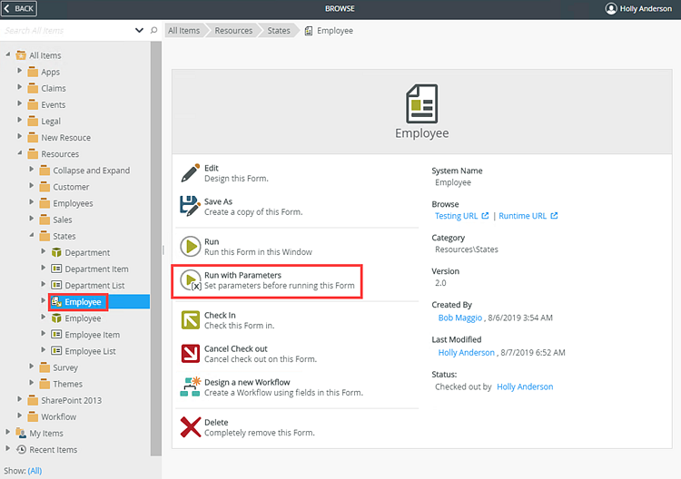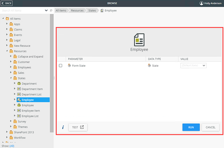 To test or troubleshoot the states, select the Employee form and click Run with Parameters.