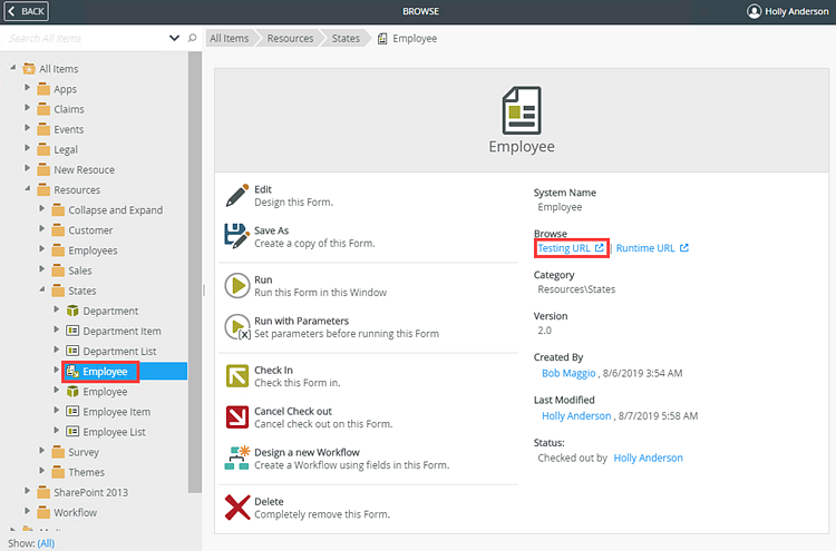 - Testing URL - opens the form in designer mode such as https://[domain]/Designer/Runtime/Form/Employee/