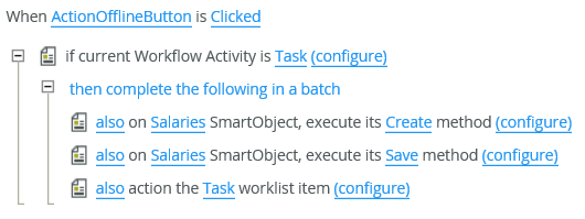 - Batch rule actions together using the complete the following in a batch execution type because only one call is made to the server when you use offline forms. It is recommended that you have one action button and the rule for this button must contain all actions that you want to record when offline. SmartObject method actions and workflow-related methods are examples of actions that must be recorded while offline.