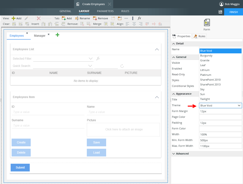 You can use the Theme parameter to test what views and forms look like when you apply a different theme. Or you can configure a rule and use the theme parameter to change the theme when something happens on the form. You can also configure rules and use the theme parameter in your rules.