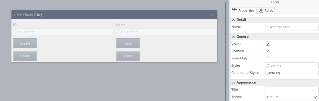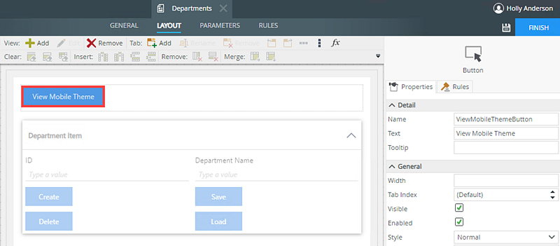 In this example, you use a form called Departments containing the Department Item view. You apply the Blue Void theme to your form by default, and configure a rule to change the theme to Lithium when you click a button. This rule contains a navigate to a URL action, which you configure with the link to the form and the new theme (Lithium) parameter. The images below show the form and rule configuration.