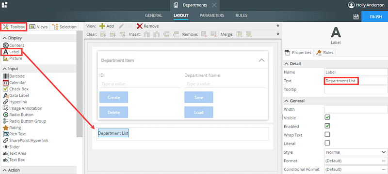 From the Toolbox, drag a Label onto the Departments form. Type Department List into the Text field to rename the label.