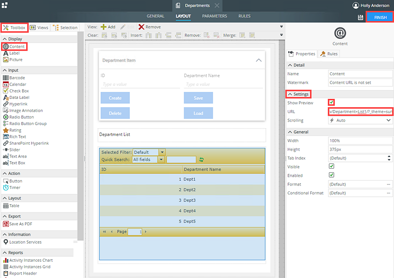 From the Toolbox, drag a Content control onto the form. In the Setting section, paste the copied Department List runtime URL in the URL field and check the Show Preview check box. Click Finish to save the form.