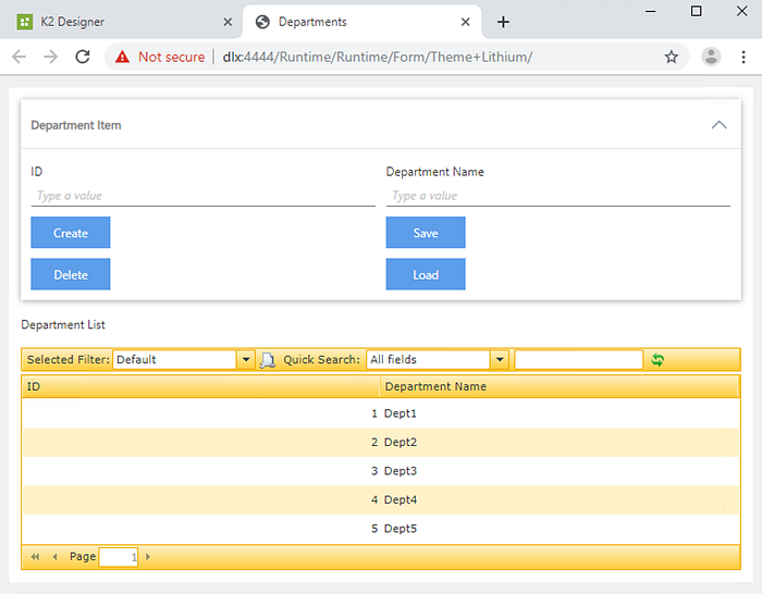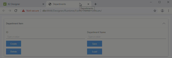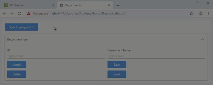 To test the Open Employees List button, from K2 Designer select the Departments form and click the Testing URL link.