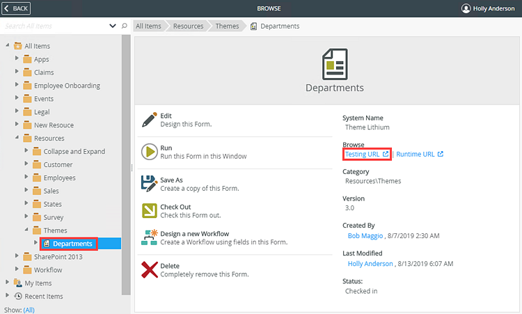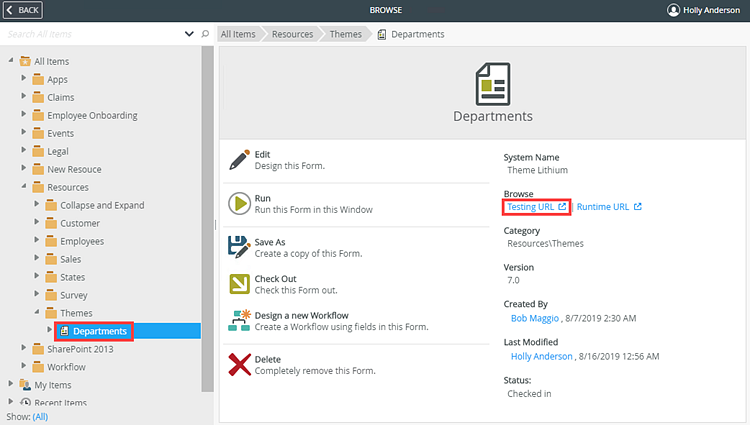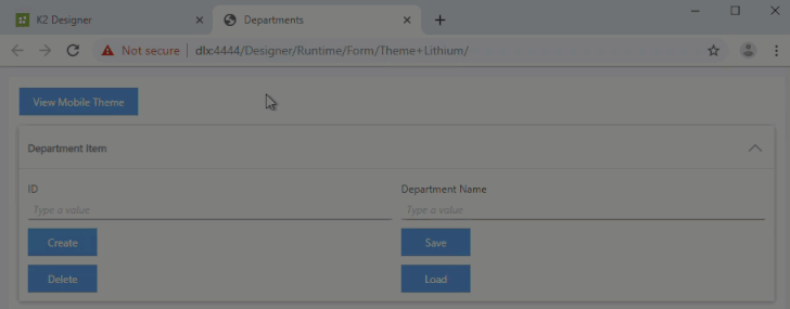 To test the View Mobile Theme button, from K2 Designer select the Departments form and click the Testing URL link.