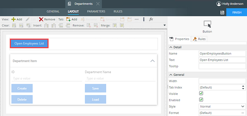 In this example, you use a form called Departments containing the Department Item view. You apply the Blue Void theme to your form and configure a rule to change the theme when you click a button. This rule contains a navigate to a URL action, which you configure with the view (Employee List) URL and the new theme (Sun) parameter. The images below show the form and rule configuration.