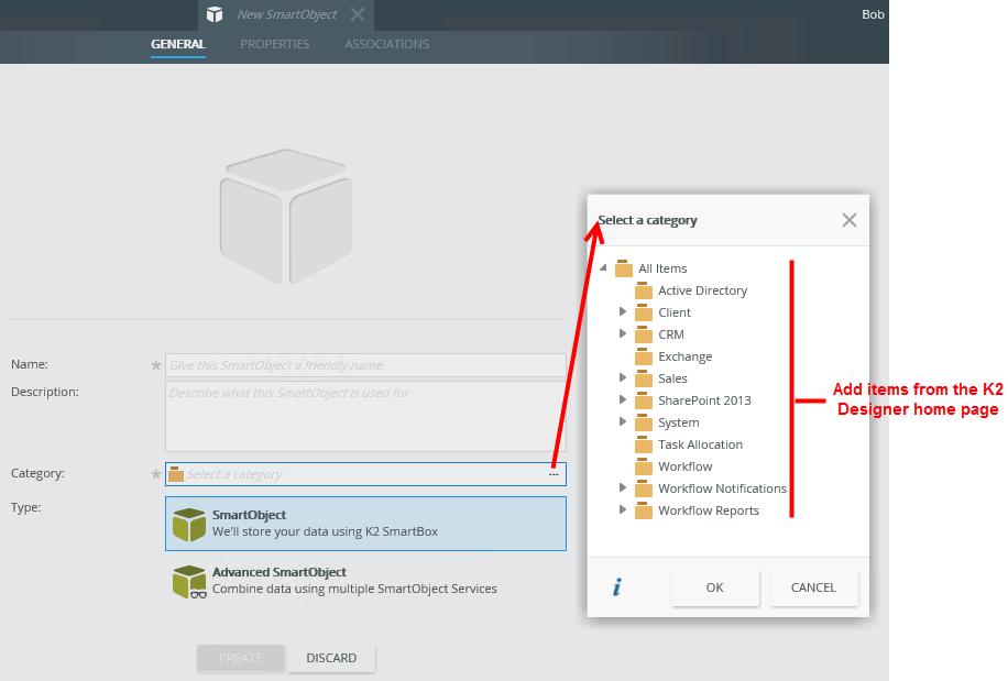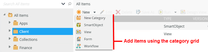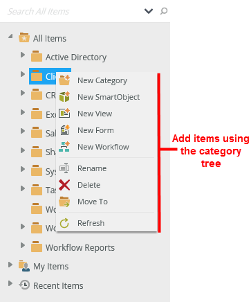 You can use one of the following methods to add new items (such as SmartObjects, views, forms, and workflows) to the category tree: