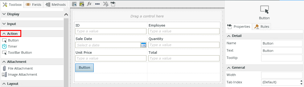 - Drag the control onto the canvas. You can find the control in the Action section of the Toolbox.