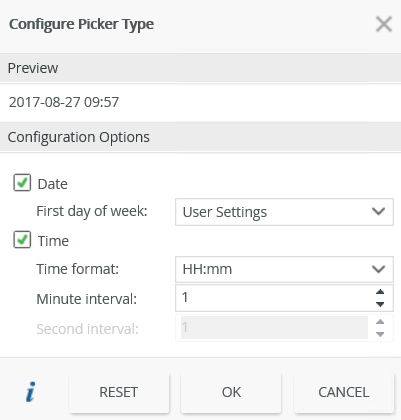 - When you apply a Date and Time format using the Styles property, it is important to keep the format in sync with the settings of the Picker Type property to ensure correct expected behavior. For example, when you use Full date/time format in the Style Builder and you select the Time option in the Picker Type property, the value displays in Full date/time format, but when you click on the Calendar picker, you can only edit the time