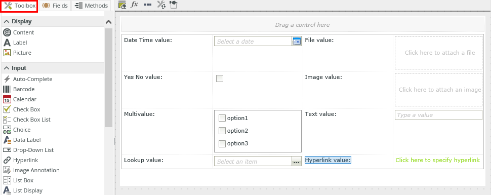 Input | Barcode | Allows you to capture barcodes in a form when using the K2 Mobile app (on supported devices) |