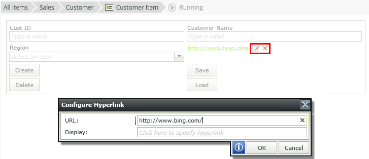 You have the option to change or delete the hyperlink when you run the view or form. To do this, disable the Read-Only property of the control, run the view or form, and hover over the hyperlink to see the edit and delete icons. When you click the edit icon, you can configure the URL and display of the hyperlink. When you run the view or form again, the URL and display values change back to the pre-configured values.