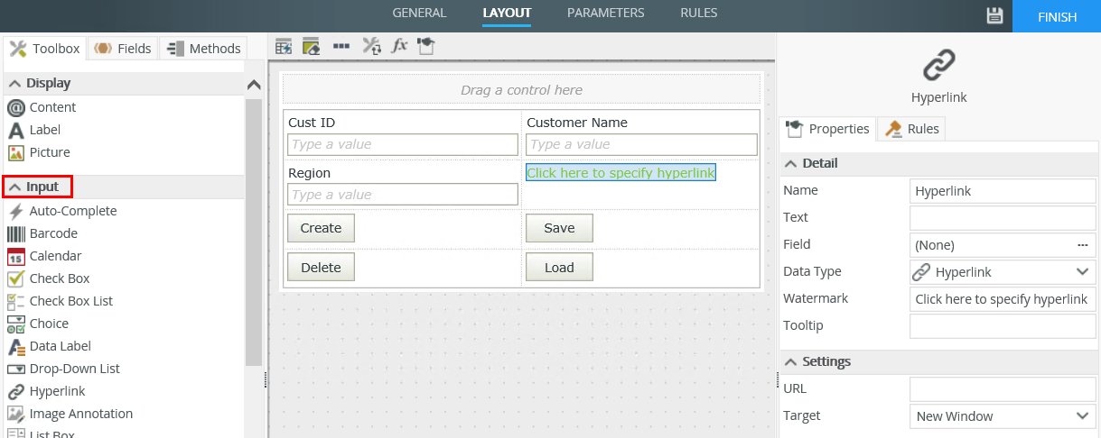 - Drag the control onto the canvas. You can find the control in the Input section of the Toolbox.