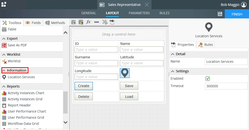 Timeout | The amount of time the application tries to pick up the location of the device, measured in milliseconds. | Yes, see Control Properties Actions for more information. |