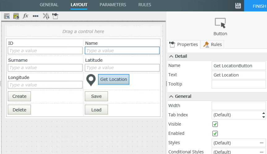 - If you want to retrieve the values of the control when you use the When [control] is Location Changed rule event, you need to add an action to do so, for example to transfer the data