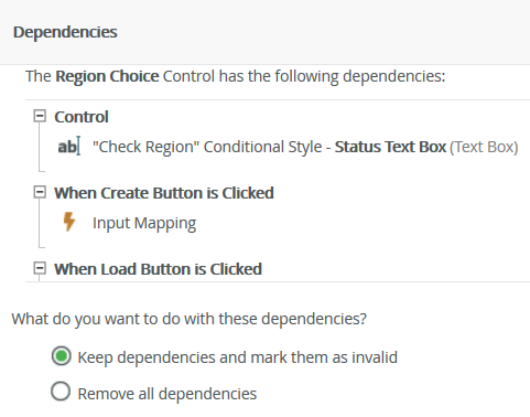 When you build forms and views, add and configure rules and controls, and map to SmartObjects or workflows, you create dependencies among these items. For example, if a view contains a text box, and the text box is associated with a rule, a dependency exists between the text box and the rule. If you delete the text box, the rule can't execute because of the missing dependency.