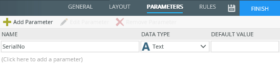 - Next, add a form parameter to use with the workflow activity and worklist item rules. Navigate to the Parameters tab and create a parameter called SerialNo of type Text.