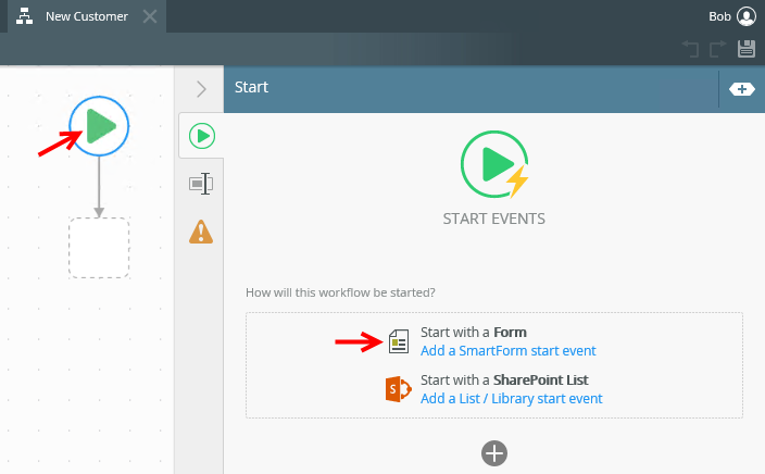 - Create a new workflow called New Customer, double click the Start event to edit the event, and select Start with a Form.