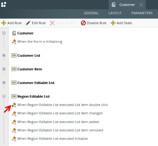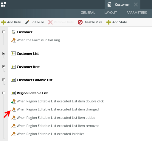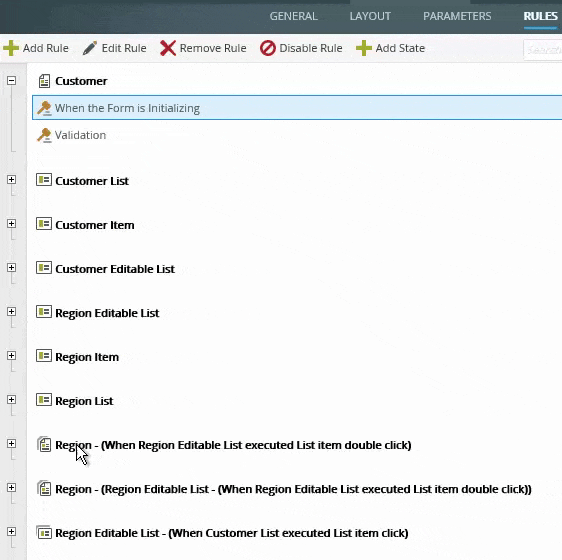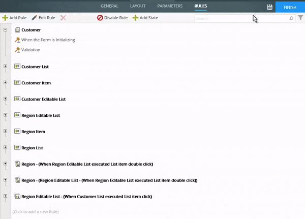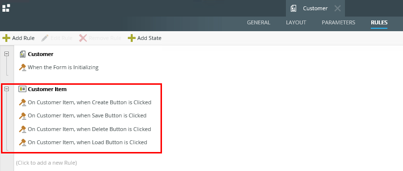 - Edit the form, navigate to the rules, and edit the On Customer Item when Create Button is Clicked rule. The extended rule now shows the