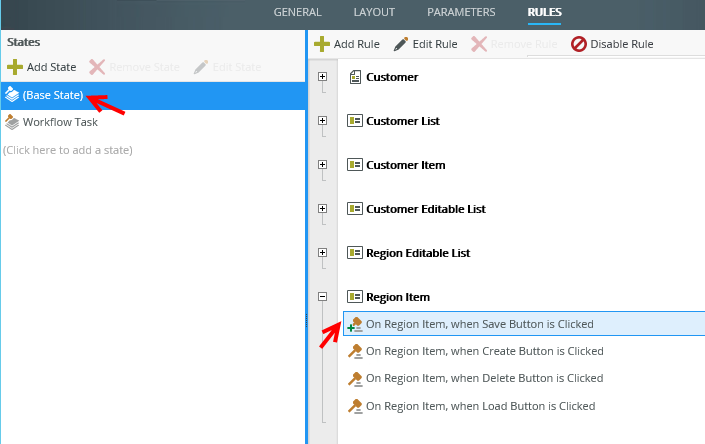 Another example is when you integrate a workflow with a form, some rules are automatically extended. In the images below, the Base State is configured to start the workflow. The On Region Item, when Save Button is Clicked rule is extended in this case.