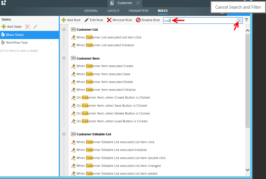 You can use search criteria to filter what you see in the rules list. When navigating back and forth between screens, and selecting another state in a form, your search criteria is maintained. Clear the search by clicking the Cancel Search and Filter icon. If you have many rules, you can use the filter and search features together to filter the results even further.