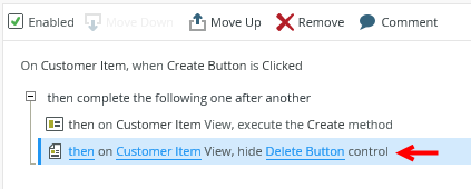 - Edit the On Customer Item when Create Button is Clicked rule and add an action to hide a view control.
