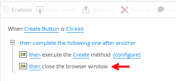 - The action that you added to the rule on the form does not show. Add a Close the browser window action.