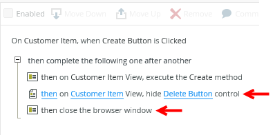 action you added to hide the Delete button and the close the browser window action.