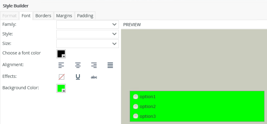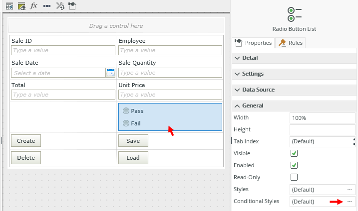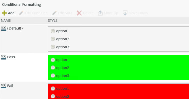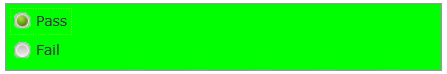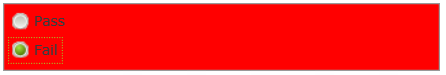In the example below, a Radio Button List control contains the values Pass and Fail. If you select the Pass option, the background color of the control changes to green. If you select the Fail option, the background color of the control changes to red. Use the following steps to configure this conditional style: