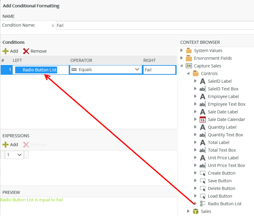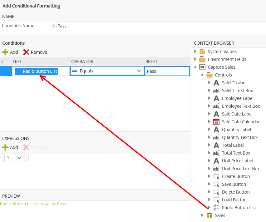 Specify the condition name, and then drag the Radio Button List control from the Context Browser into the left condition field and type the word Pass in the right condition field. Note the Preview at the bottom. Click OK. You can add more complex conditions by adding more than one condition and using Expressions to control how they are logically related. Use Preview to verify the statement.