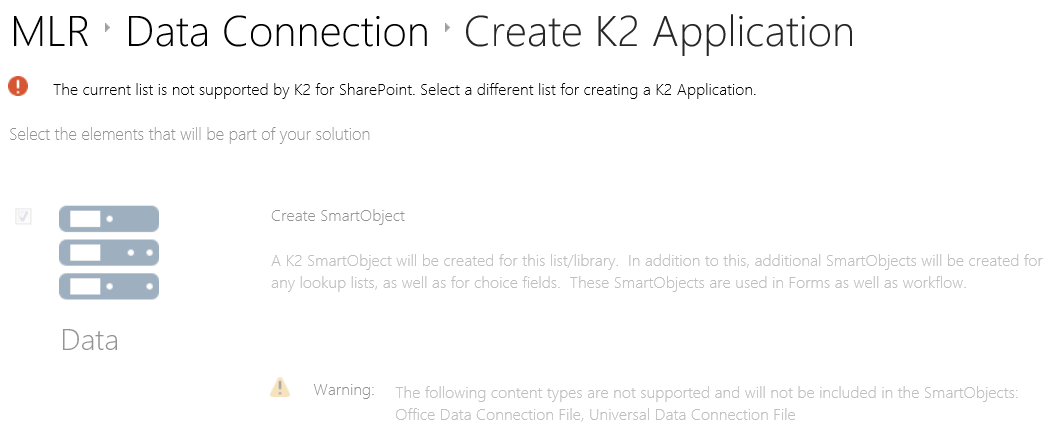 For unsupported lists and libraries (for example a Data Connection Library), K2 does not create a SmartObject nor the associated Forms and Views. For these unsupported lists and libraries, the Create K2 Application page will display an error message and prevent you from creating any artifacts, as shown below.